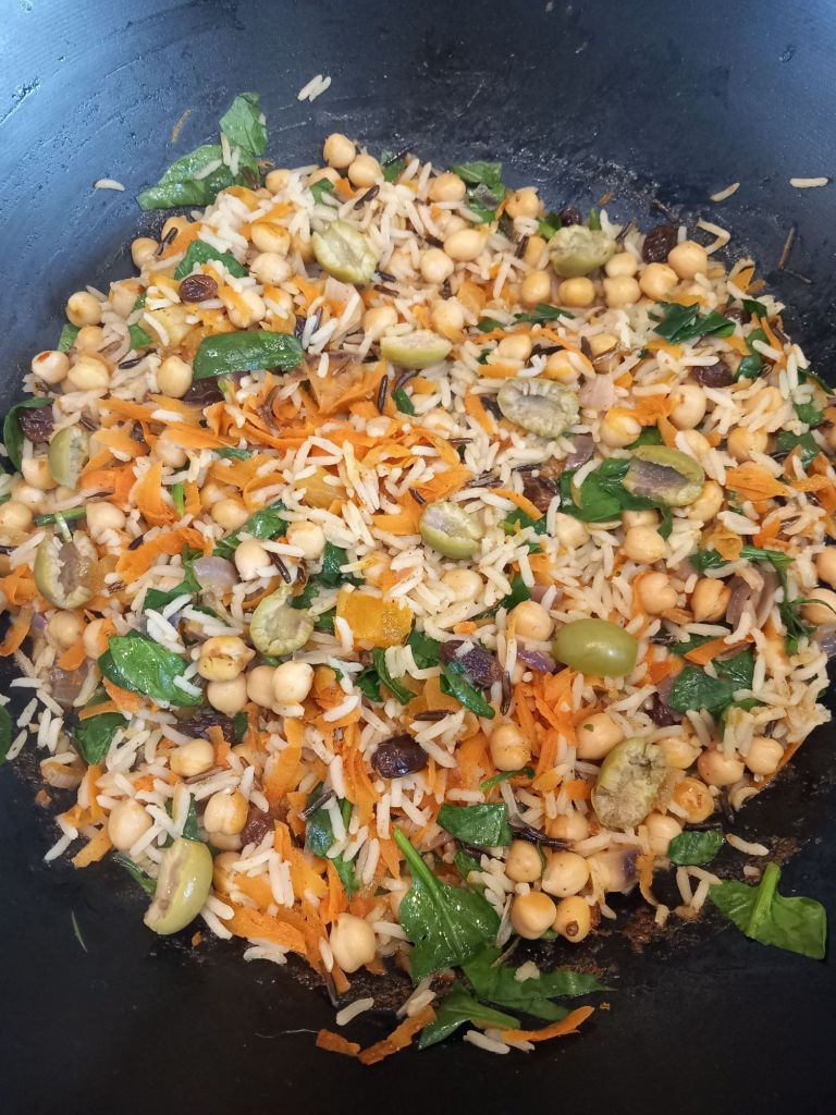 - When the rice or grains are all cooked, turn off the heat and add whatever toppings you like: fresh herbs, olives, desicated coconut, nuts or seeds, even fruit like dried apricots, raisins, or chopped apples or grapes. If you have something in the cupboard in too small an amount to use for a “normal” recipe, chuck it on top!